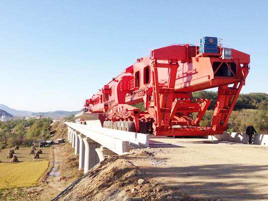 以及生產(chǎn)更新運架產(chǎn)品能架設跨度40M高速鐵路箱梁的:SXJ1000T/40M一跨式架橋機(配套攀爬式運梁車可以實現(xiàn)過隧道零距離架梁)和攀爬式運梁車。并能對現(xiàn)有32M分體式運架設備進行改造,改造后能實現(xiàn)高低位架設跨度40M高速鐵路箱梁(高位改造不能過隧道,把原架橋機改造一跨式,把原運梁車增加2軸。低位改造能過隧道架梁,把原架橋機改造一跨式低位,把原運梁車改成攀爬式運梁車并增加二臺喂梁臺車實現(xiàn)過隧道架梁)。